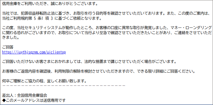 『詐欺メール』全国信用金庫協会から『【信用金庫】【重要】お客様の口座が凍結されました』と、来た件