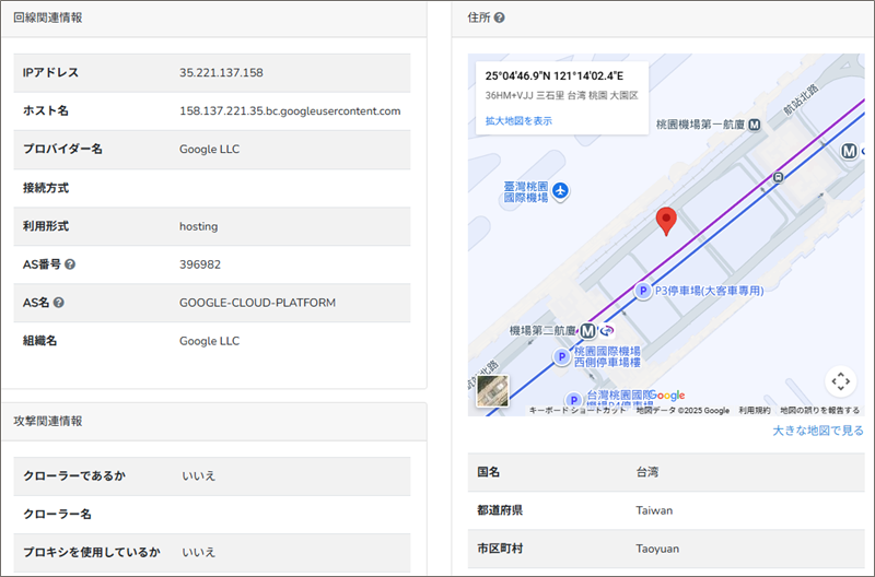 このReceivedフィールドの末尾にあるIPアドレスからメールの発信地を「IP調査兵団」で導き出してみると、台湾にある桃園空港付近です。