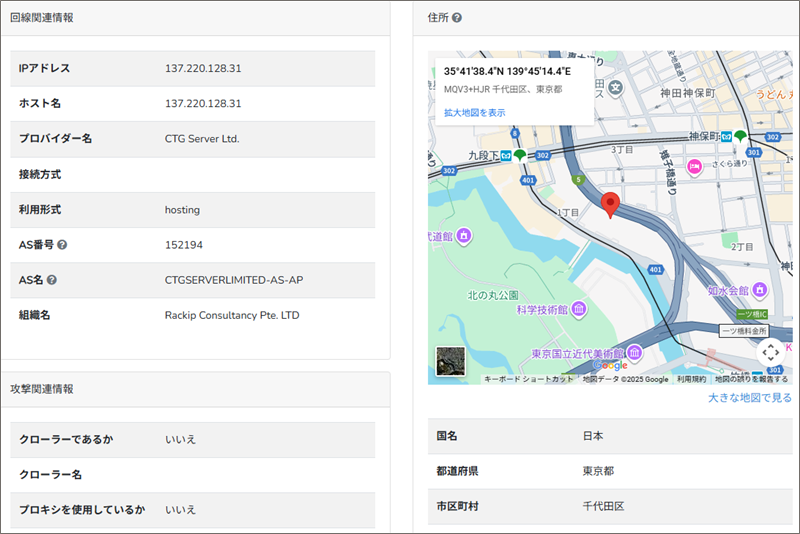 「IP調査兵団」でこのIPアドレスからそのロケーション地域を調べると、詐欺サイト設置場所は、東京都千代田区付近であることが分かりました。