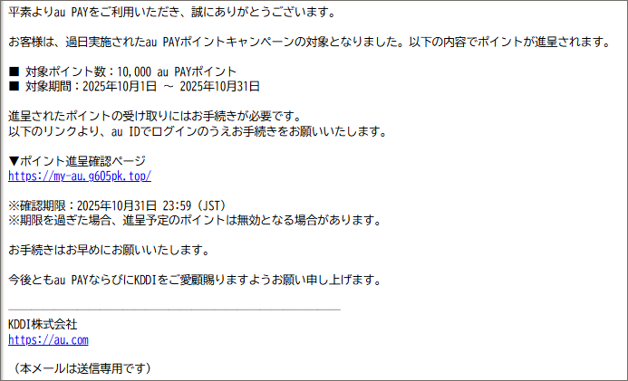 件名:[spam] au PAY 10,000ポイント進呈のお知らせ