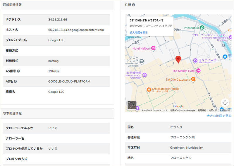 このReceivedフィールドの末尾にあるIPアドレスからメールの発信地を「IP調査兵団」で導き出してみると、オランダのフローニンゲン付近です。