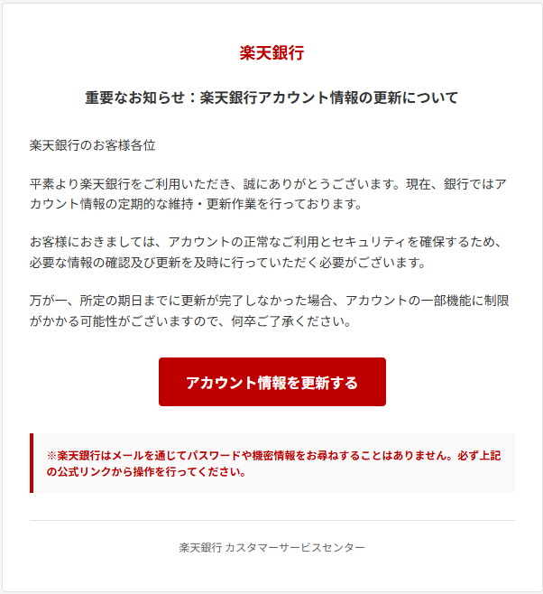 ※楽天銀行はメールを通じてパスワードや機密情報をお尋ねすることはありません。必ず上記の公式リンクから操作を行ってください。