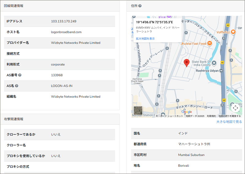このReceivedフィールドの末尾にあるIPアドレスからメールの発信地を「IP調査兵団」で導き出してみると、インドのボリバリ(Borivali)付近です。