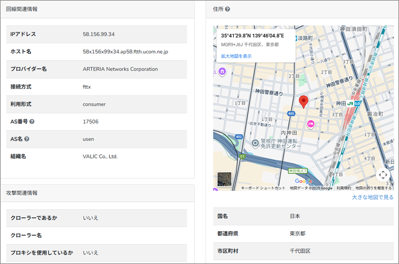 このReceivedフィールドの末尾にあるIPアドレスからメールの発信地を「IP調査兵団」で導き出してみると、JR神田駅付近です。