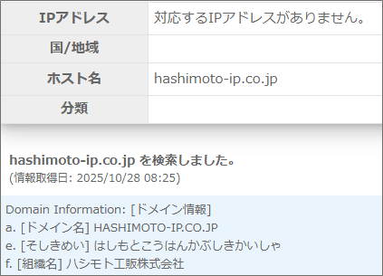 以下は、「Grupo」さんで取得したこのドメインに関する情報ですが、どうやら「ハシモト工販株式会社」と言う企業のもので、ご覧の通り「対応するIPアドレスがありません」とあるので現在利用できないもの。