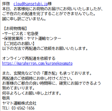 『詐欺メール』『【ヤマト運輸】お荷物お届け時ご不在のお知らせ』と、来た件