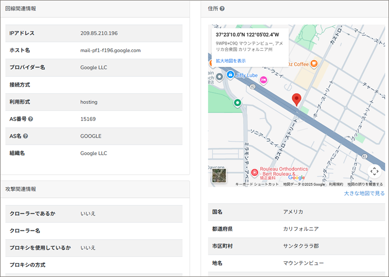 このReceivedフィールドの末尾にあるIPアドレスからメールの発信地を「IP調査兵団」で導き出してみると、カリフォルニア州にあるマウンテンビュー付近です。