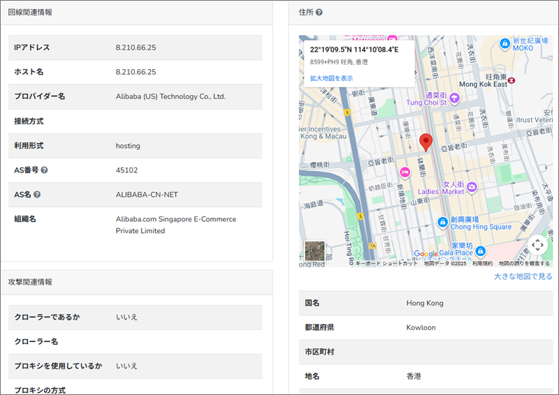 「IP調査兵団」でこのIPアドレスからそのロケーション地域を調べると、詐欺サイト設置場所は、香港付近であることが分かりました。
