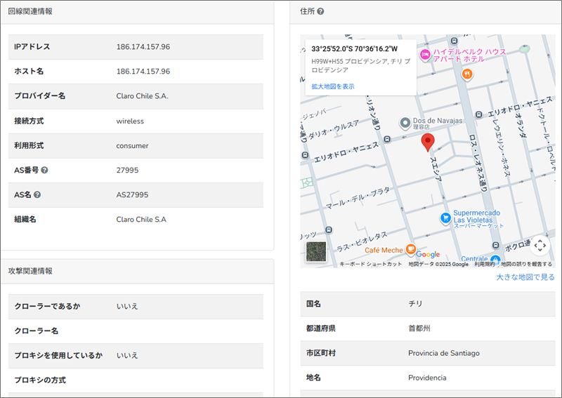 このReceivedフィールドの末尾にあるIPアドレスからメールの発信地を「IP調査兵団」で導き出してみると、チリのプロビデンシア(Providencia)付近です。