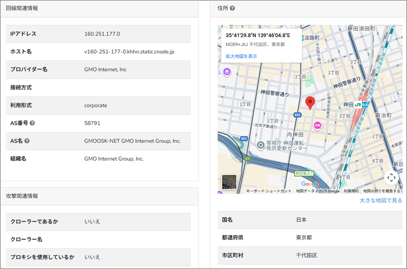 このReceivedフィールドの末尾にあるIPアドレスからメールの発信地を「IP調査兵団」で導き出してみると、ありがちなJR神田駅付近です。