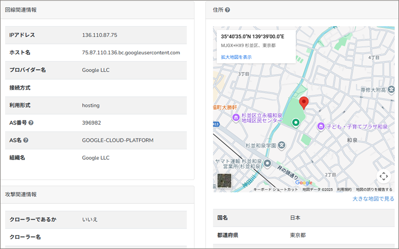 このReceivedフィールドの末尾にあるIPアドレスからメールの発信地を「IP調査兵団」で導き出してみると、東京都杉並区付近です。