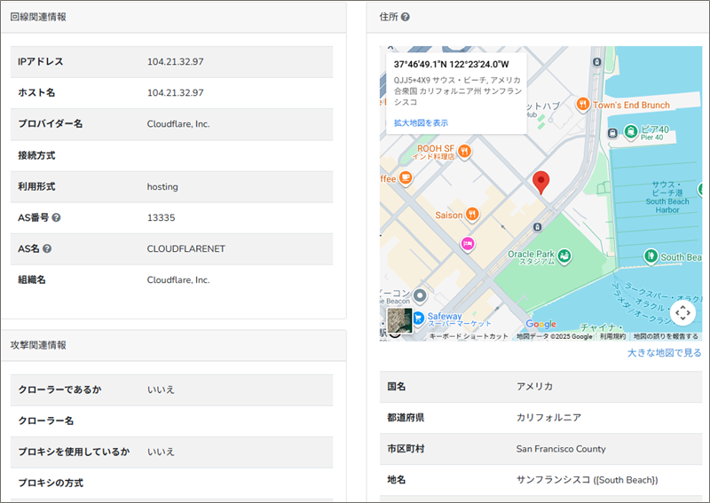 「IP調査兵団」でこのIPアドレスからそのロケーション地域を調べると、詐欺サイト設置場所は、サンフランシスコ付近であることが分かりました。