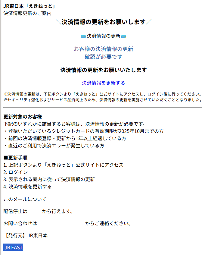 『詐欺メール』えきねっとから『<重要>決済情報更新のご案内』と、来た件