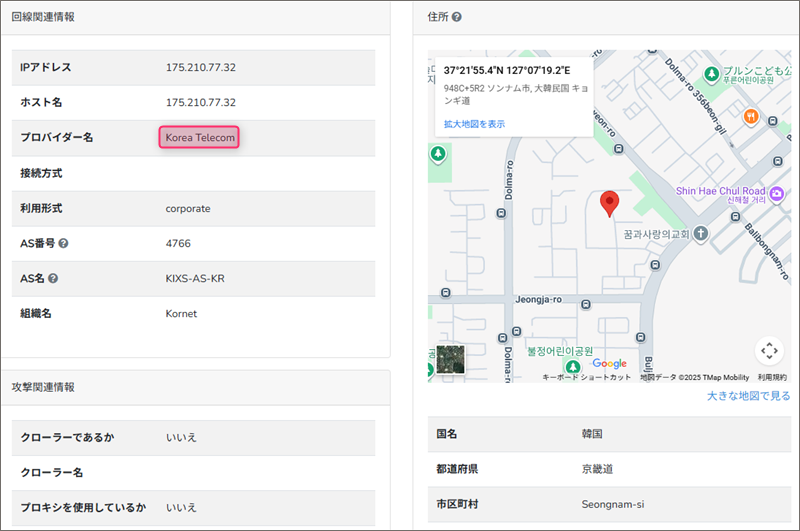 このReceivedフィールドの末尾にあるIPアドレスからメールの発信地を「IP調査兵団」で導き出してみると、韓国のソンナム市(Seongnam-si)付近で、そして利用されたプロバイダーは、韓国を代表する大手通信会社の一つ「Korea Telecom」です。