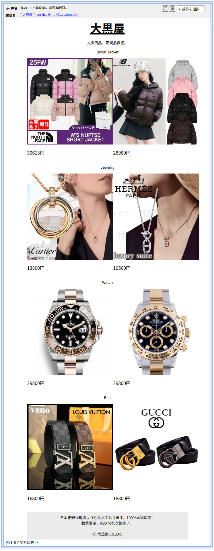 このメールには、「大黒屋から日本正規代理店より仕入れております。100%本物保証!数量限定、売り切れ次第終了。」と書いてありますが、「本物保証」などの文句は、怪しいメールによく使われるので怪しく危険なメールの可能性があります。