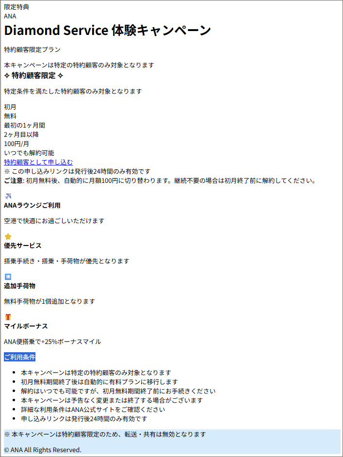 調べてみるとANAでは「2025年度「ダイヤモンドサービス」メンバー限定 選択式特典」と言うキャンペーンは行われているようですが、「Diamond Service 体験キャンペーン」なんてのは行われていないようです。