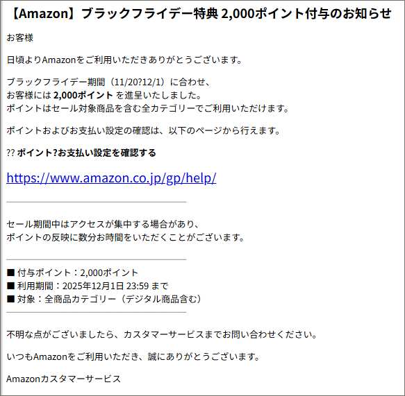 『詐欺メール』『【Amazon】ブラックフライデー特典 2,000ポイント付与のお知らせ』と、来た件
