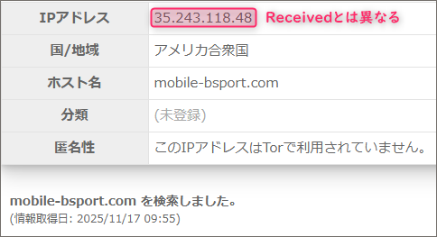 Received のカッコ内にあったIPアドレスと全然違いますよね、この結果からこの送信者が使ったとされる「mobile-bsport.com」を使ったメールアドレスは偽装であることが確定です!!