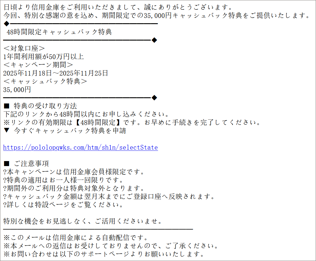 『詐欺メール』『 【信用金庫お客様限定】【48時間限定】35,000円キャッシュバック特典』と、来た件