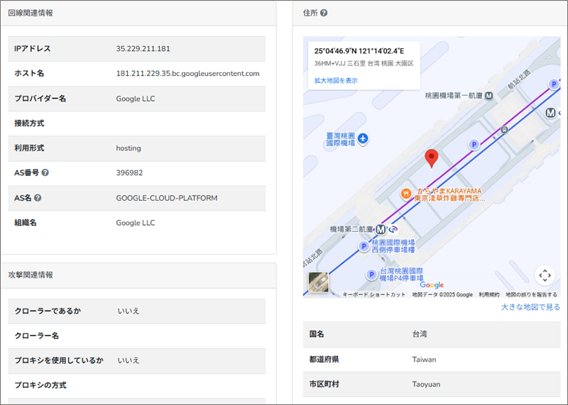 このReceivedフィールドの末尾にあるIPアドレスからメールの発信地を「IP調査兵団」で導き出してみると、台湾の桃園国際空港付近です。