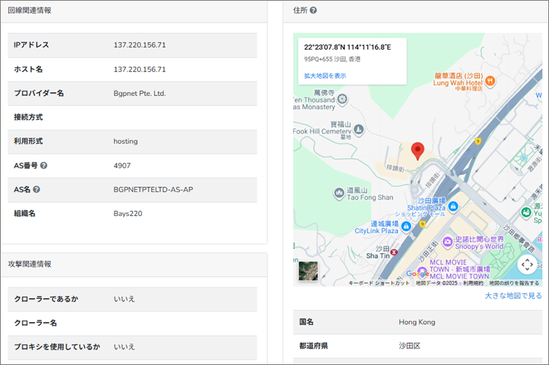 「IP調査兵団」でこのIPアドレスからそのロケーション地域を調べると、先程とは異なるものの再び香港付近であることが分かりました。