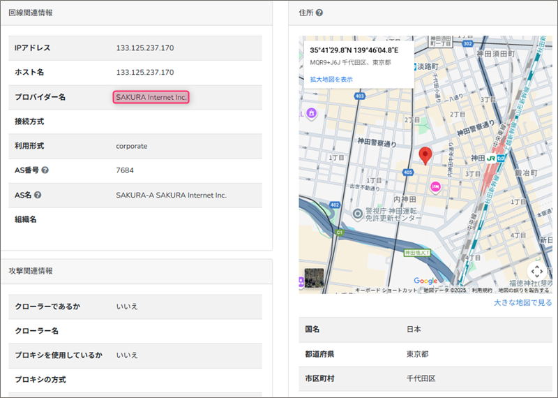 このReceivedフィールドの末尾にあるIPアドレスからメールの発信地を「IP調査兵団」で導き出してみると、JR神田駅付近で、「プロバイダー名」に「SAKURA Internet Inc.」とあるのでこのメールは、国内大手ホスティングサービスの「さくらインターネット」のサーバーを利用して送られてきたことも分かりました。