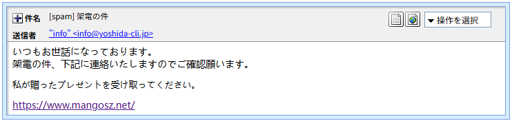 この件名の見出しには”[spam]”とスタンプが付けられているので迷惑メールの類です。