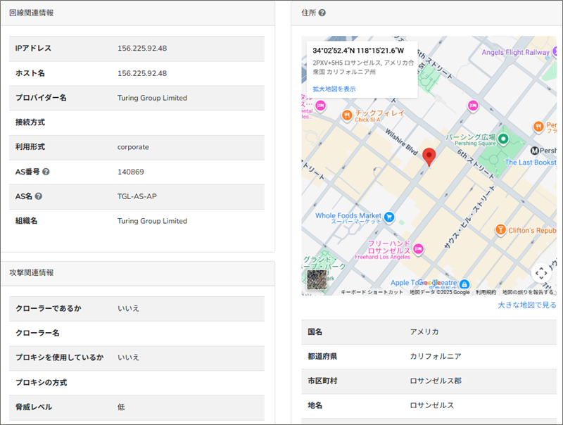 IP調査兵団」でこのIPアドレスからそのロケーション地域を調べると、詐欺サイト設置場所は、ロサンゼルス付近であることが分かりました。