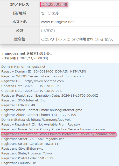「Registrant Organization」には「Whois Privacy Protection Service by onamae.com」と記載されています。