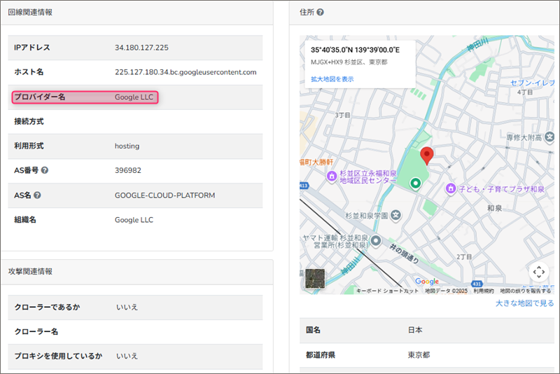 このReceivedフィールドの末尾にあるIPアドレスからメールの発信地を「IP調査兵団」で導き出してみると、東京都杉並区付近です。