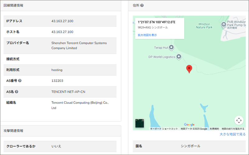 「IP調査兵団」でこのIPアドレスからそのロケーション地域を調べると、詐欺サイト設置場所は、シンガポール付近であることが分かりました。