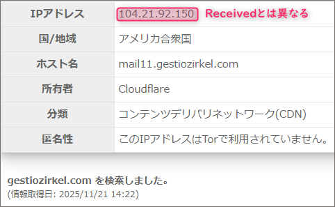 Received のカッコ内にあったIPアドレスと全然違いますよね、この結果からこの送信者が使ったとされる「mail11.gestiozirkel.com」を使ったメールアドレスは偽装であることが確定です!!