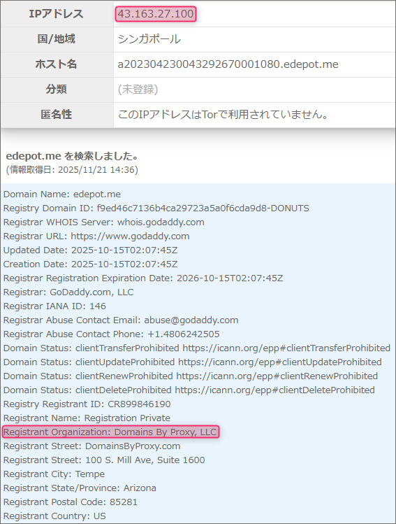 「Registrant Organization」には「Domains By Proxy, LLC」と記載されています。