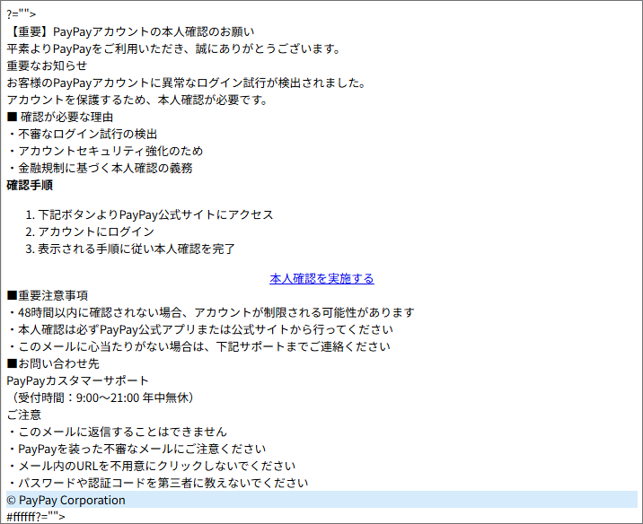 無理やりな「本人確認」の依頼と、「異常なログイン試行」「48時間以内の確認が必要」「アカウント制限の可能性」などという焦らせる表現はその特徴とも言えるでしょう。
