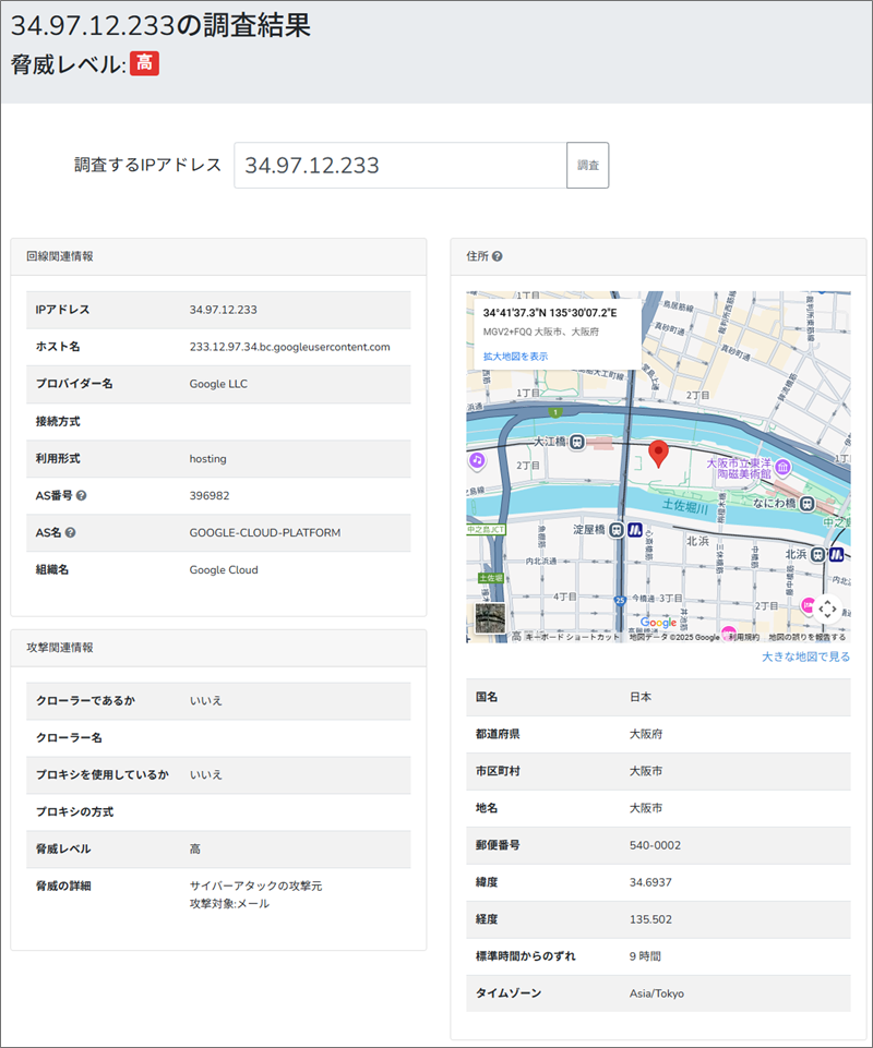 このReceivedフィールドの末尾にあるIPアドレスからメールの発信地を「IP調査兵団」で導き出してみると、大阪市庁舎付近です。