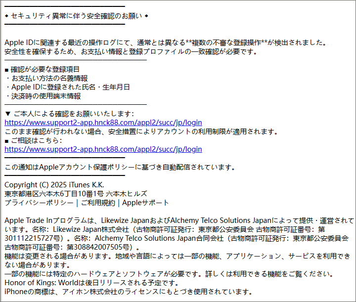 「アカウント停止」「安全確認」「支払い情報確認」など緊急性を煽る手口は詐欺メールの典型的な文言で、Appleは突然支払い情報や生年月日を入力させることはしません。