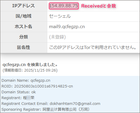 ドメインに割当てているIPアドレスとReceivedのカッコ内にあったIPアドレスが合致したので、この送信者は自身のメールアドレスを偽ることなく何食わぬ顔でこのメールを送信してきたことになります。