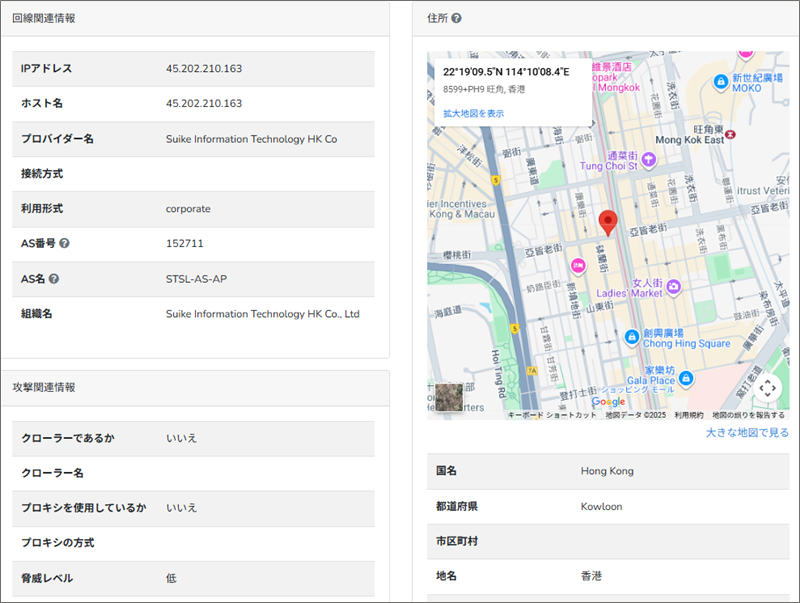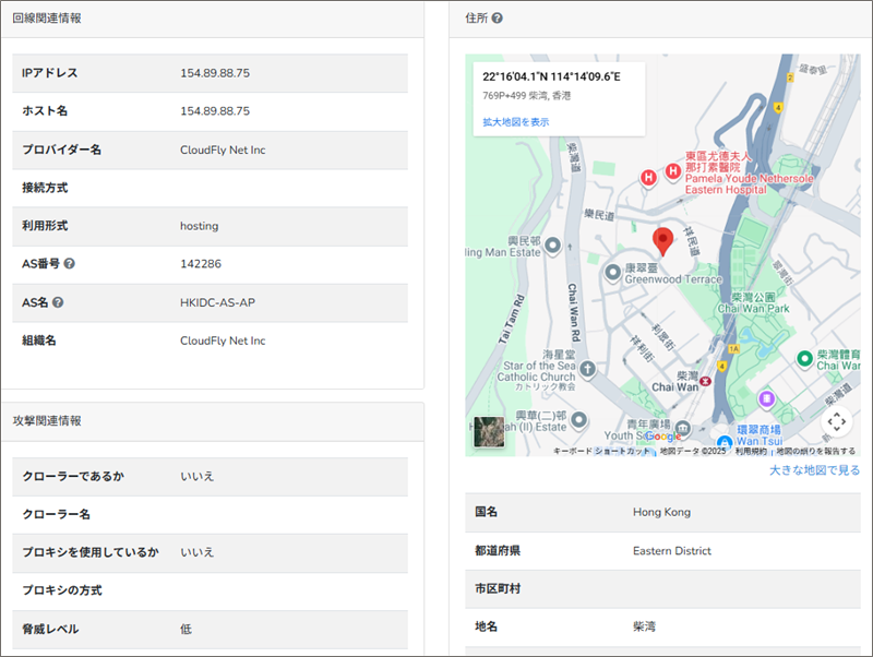 「IP調査兵団」でこのIPアドレスからそのロケーション地域を調べると、先程とは異なるものの再び香港付近であることが分かりました。