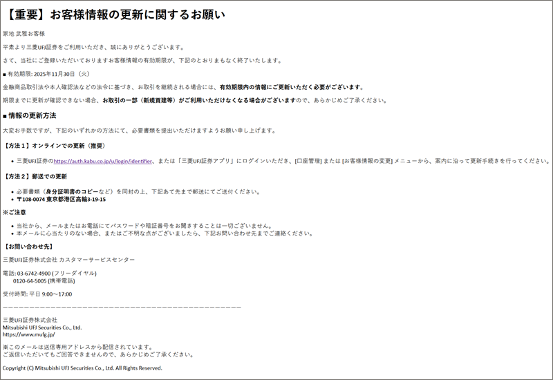 『詐欺メール』三菱UFJ証券『【重要】お客様情報の更新に関するお願い』と、来た件