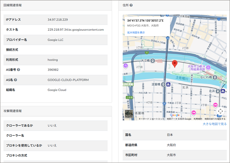 このReceivedフィールドの末尾にあるIPアドレスからメールの発信地を「IP調査兵団」で導き出してみると、大阪市役所付近です。