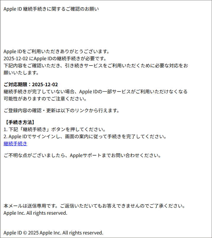 このメールは、Apple IDの継続手続きが必要になったことを知らせるもので、メールに付けられたリンクから継続手続きを行うように促すものです。