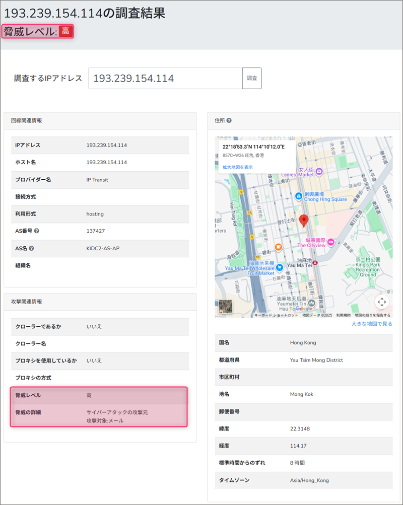 このReceivedフィールドの末尾にあるIPアドレスからメールの発信地を「IP調査兵団」で導き出してみると、香港付近です。