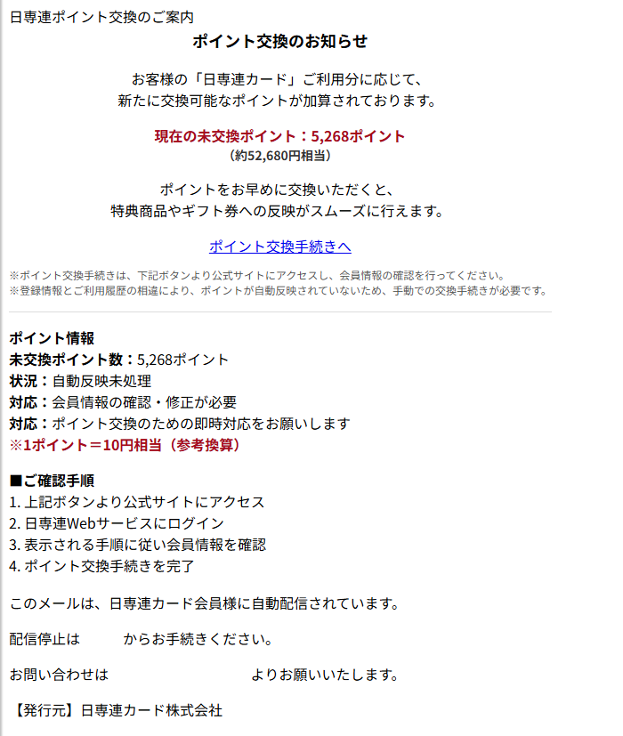 どうやらこのメールは、日専連が発行するクレジットカードのポイントに関する内容のようで、所持するポイントを商品やギフトカードに交換するように促すものです。