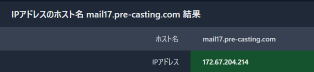 では、試しにドメイン「mail17.pre-casting.com」を割当てているIPアドレスとカッコ内のIPアドレスを比較してみましょう。