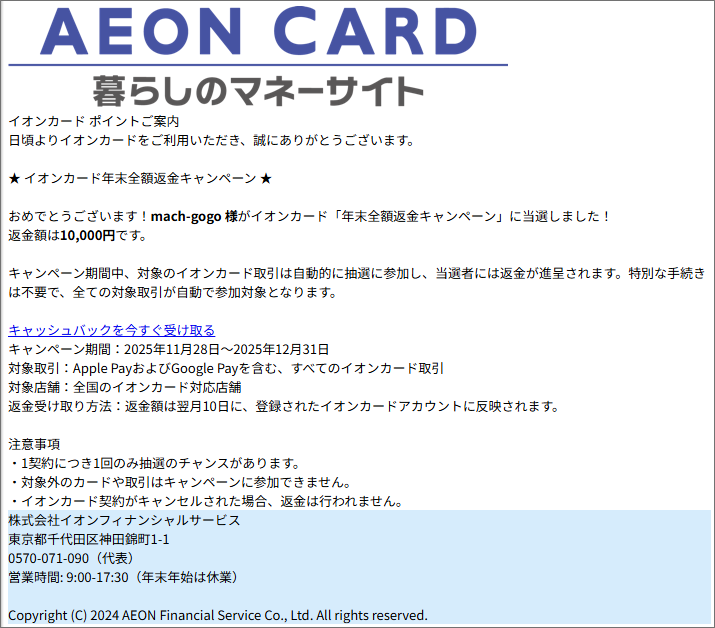 『詐欺メール』『【年末特典】AEON Cardご利用で最大10,000円返金!』と、来た件