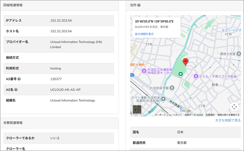 「IP調査兵団」でこのIPアドレスからそのロケーション地域を調べると、詐欺サイトではありがちな東京都杉並区付近であることが分かりました。