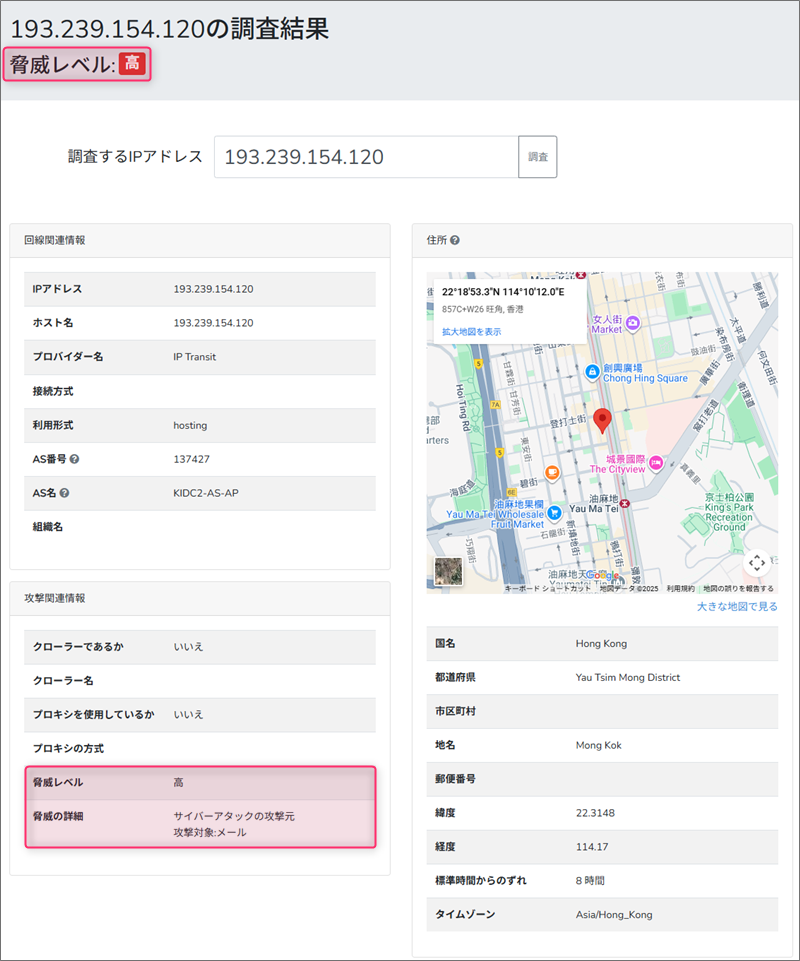 このReceivedフィールドの末尾にあるIPアドレスからメールの発信地を「IP調査兵団」で導き出してみると、香港付近です。