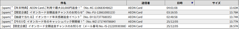 件名:[spam] 【年末特典】AEON Cardご利用で最大10,000円返金!"(No.-KC-11068304862)