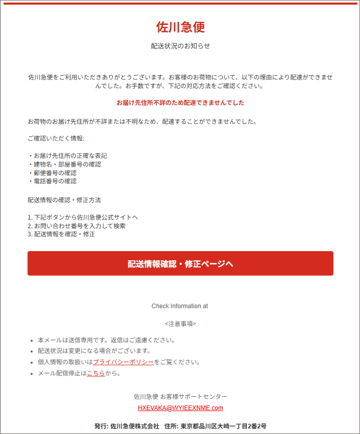 そして「佐川急便 お客様サポートセンター」とされるメールアドレスが「HXEVAKA@WYIEEXNME.com」などとという不規則なアドレスになっていて、公式の企業のものとは到底思えません。