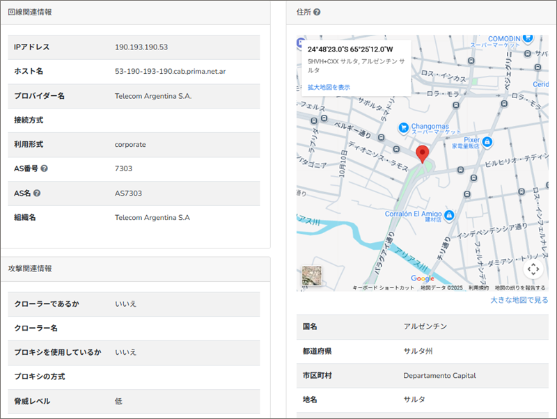 このReceivedフィールドの末尾にあるIPアドレスからメールの発信地を「IP調査兵団」で導き出してみると、なんとアルゼンチンのサルタ付近です。